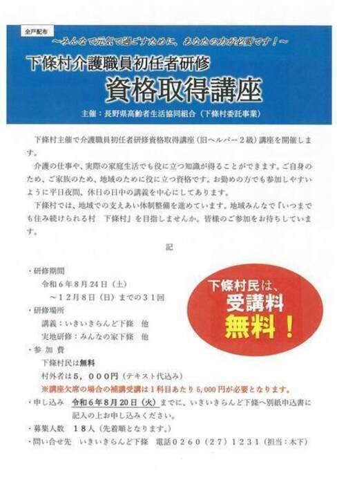 令和6年度下條村介護職員初任者研修 資格取得講座の開講について