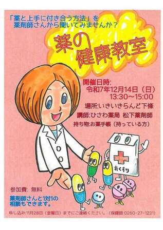 12月14日(日)、いきいきらんど下條にて、薬の健康教室を開催します。