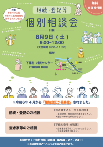 8月9日(土)午前9時~12時まで(受付は11時30まで)、下條村 村民センターにて司法書士および役場総務課による「相続・登記等個別相談会」が開催されます。ご希望の個別ブースにてご相談いただけますので、ぜひこの機会にお越しください。
