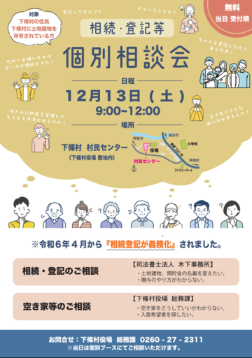 12月13日(土)午前9時~12時まで(受付は11時30まで)、下條村 村民センターにて司法書士および役場総務課による「相続・登記等個別相談会」が開催されます。ご希望の個別ブースにてご相談いただけますので、ぜひこの機会にお越しください。