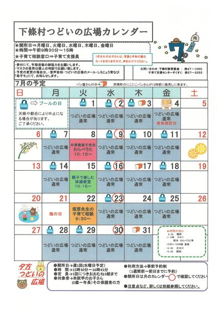 7月つどいの広場カレンダー(令和7年7月25日改訂版)